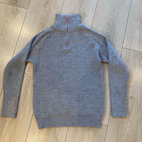 Ullgenser for herre i størrelse L. Genseren er blå med tradisjonelt flerfarget mønster i hvitt og rødt, inkludert mønster på ermer og rundt hals. Strikket i ull, som gir god varme og egner seg til hverdagsbruk og utendørsaktiviteter i kjølige temperaturer.