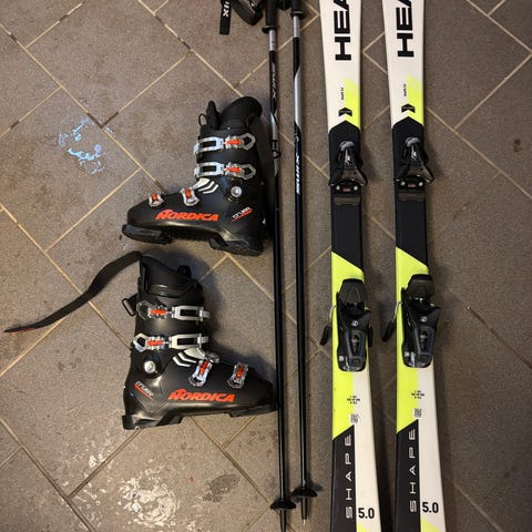 Head alpinski sett med støvler, staver og hjelm. Skiene er carvingski med integrerte bindinger. Til settet følger det med et par alpinstøvler i grå farge med flere justerbare spenner, et par røde skistaver samt en grå alpinhjelm med hvit skibrille. Utstyret passer til alpint bruk i bakke og kan egne seg for rekreasjonskjøring. Støvler, ski, staver og hjelm selges samlet som et komplett alpinsesett. Sko str ca38-39. Ski 163 cm