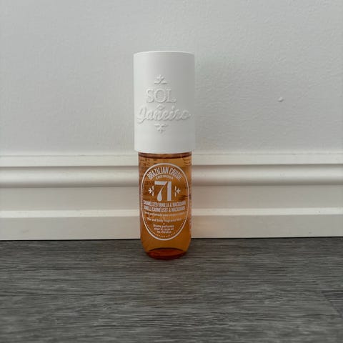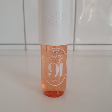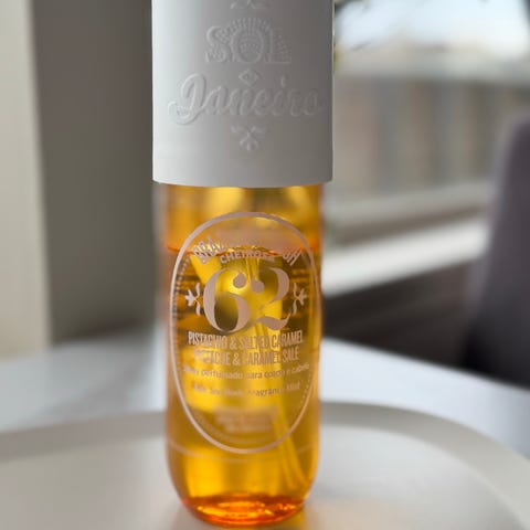 Sol de Janeiro Brazilian Crush Cheirosa 62 kroppsspray med duft av pistasj og salt karamell. Flasken er omtrent halvfull.