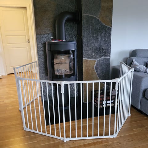 Hvit ovnsgrind/ peisgrind eller trappegrind fra Babydan. 4 deler. To med feste til veggen og en med åpning. Litt misfarging der man åpner, ellers ser den ganske fin ut. Kun brukt en vintersesong.