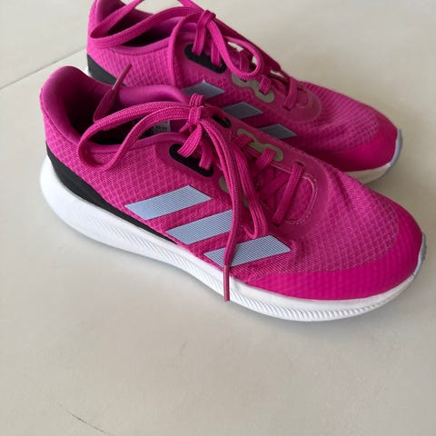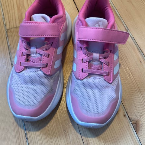Adidas joggesko for jente i rosa og hvitt. Skoene har overdel i tekstil med syntetiske detaljer og borrelåslukking kombinert med elastiske lisser for enkel av- og påkledning. Yttersålen er i hvit gummi med mønster for bedre grep. Egnet som hverdagssko og til lett aktivitet for barn. Brukt en gang.
