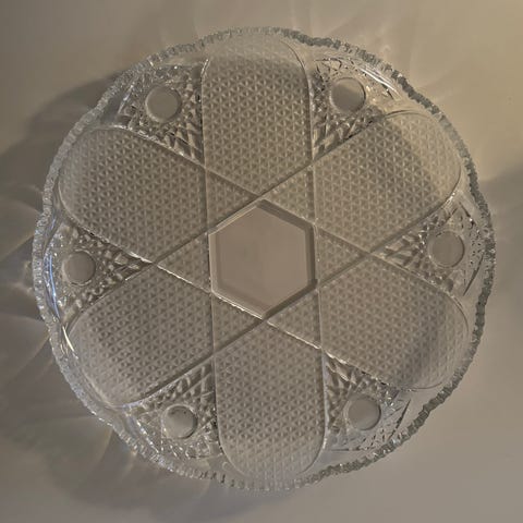 Selger et fint sett med service fra Royal Bone China. Settet består av fire store firkantede tallerkner som er hvite med sølvkant. Og fire mindre med blomstrete mønster.