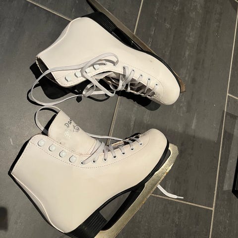 Davos kunstløpskøyter i størrelse 36. Klassisk hvit modell med snøring og hæl i mørk plast. Skøytene har fastmontert stålskinne til bruk på isbaner.