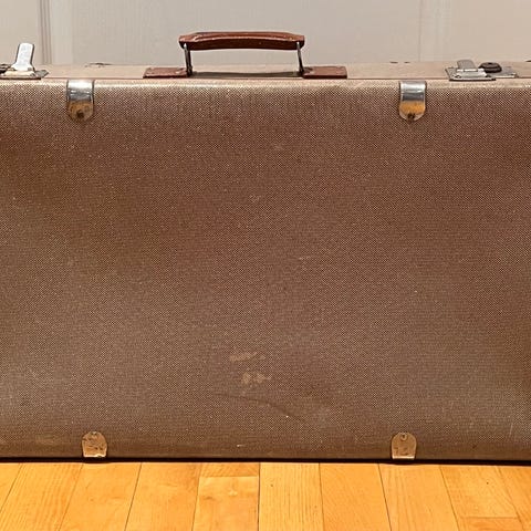 Koffert er fra 1950-tallet og virker å være i en slags behandlet «papp». Den har vært på mange turer og har målene: lengde 69 cm, bredde 41 cm og høyde 18 cm. Kofferten må hentes i Trondheim
