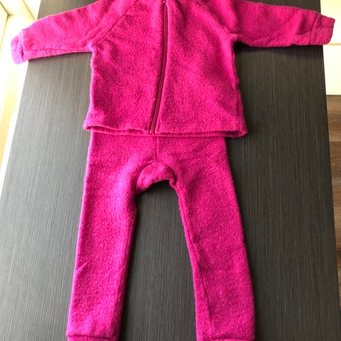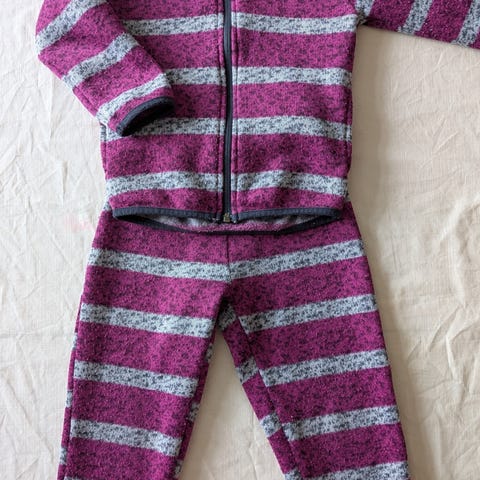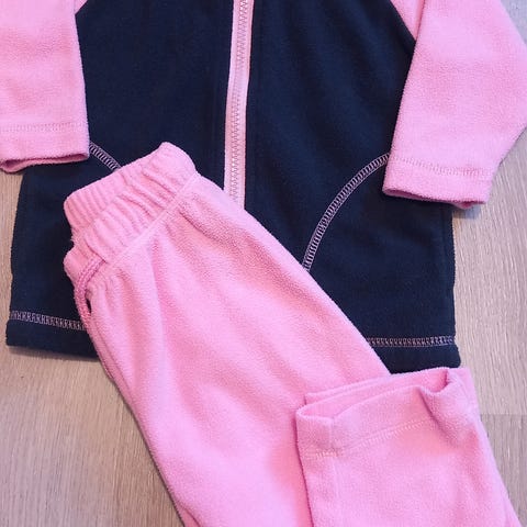 Pent brukt fleece sett med bukse og jakke med glidelås fra Stormberg. Settet er i lilla- to er og er i strl 5 år. Tykk fleece.