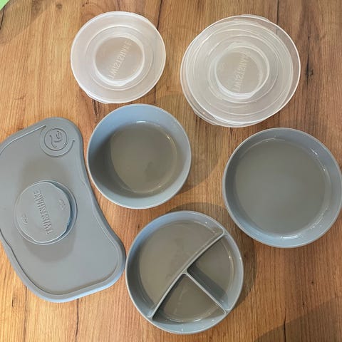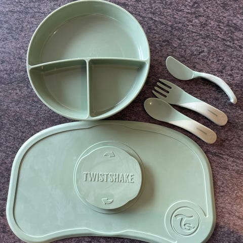 To fat og en skål med tilhørende lokk fra Twistshake. Med vakuum-teknologi holder spisebrikken tallerkenene trygt på plass på alle flate og glatte overflater. De er BPA-fri og kan vaskes i oppvaskmaskinen.