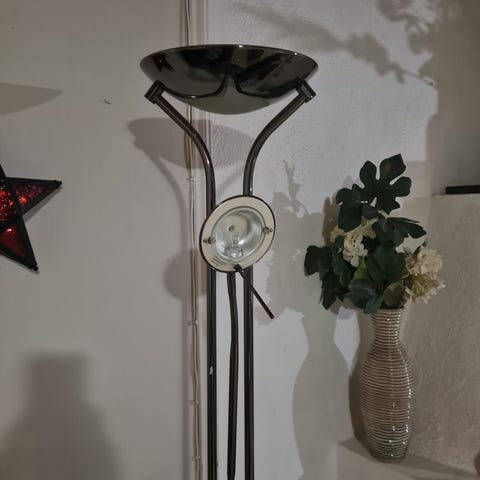 gulvlampe i metall. Lampen har dreid metallstang og fot med tre buede ben. Øverst har den en kjegleformet skjerm og to ekstra lyspærer på siden av sokkelen. Passer som belysning i stue, gang eller andre oppholdsrom. Bruker standard lyspærer med vanlig skrusokkel (E27). Strømkabel med støpsel følger med.