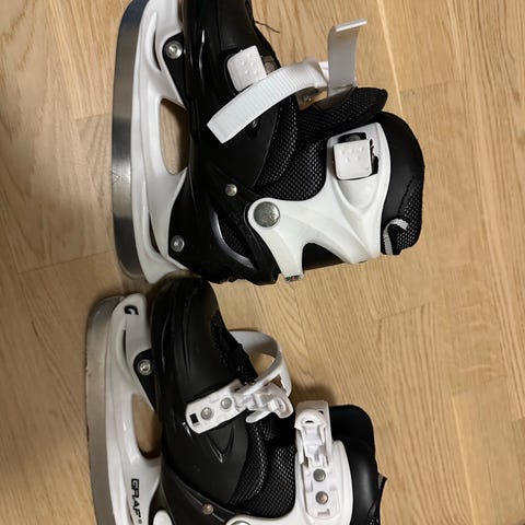 Ukjent merke justerbare skøyter i hvit farge med sorte og røde spenner. Skøytene har hard ytterskall med justeringsmulighet i flere størrelser, synlig på siden av skoen. Blad i metall egnet til bruk på isbaner. Passer som allround skøyter til fritidsbruk for barn eller mindre voksne, avhengig av innstilt størrelse.