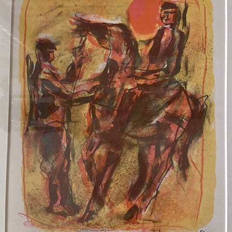 Selger et sett med 4 litografier av Theo Tobiasse, samlet eller per stk. Motivene er abstrakte/figurative komposisjoner i flere farger, blant annet rødt, gult, grønt og blått. Hvert trykk er innrammet med lys passepartout og enkel, lys ramme. Bildene kan henges samlet som en serie eller hver for seg, og passer til veggdekor i stue, gang eller kontor.