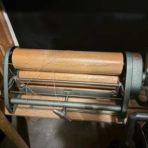 Trepresse i ukjent merke, laget i heltre med to gjengede skruer og øvre og nedre plate. Kan brukes som enkel presse til ulike kjøkkenformål eller hobbyprosjekter. Klassisk, manuell konstruksjon uten mekaniske eller elektriske deler.