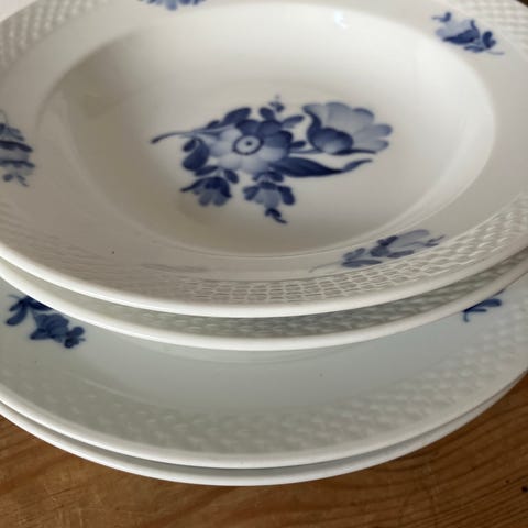 Royal Copenhagen tallerken i hvitt porselen med blå dekor. Tallerkenen har klassisk, håndmalt blomstermotiv og rillet kant. Egner seg til servering av måltider i hverdagen eller ved mer formelle anledninger, og kan kombineres med annet servise fra Royal Copenhagen i lignende stil.
