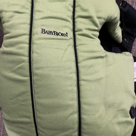 Babidéal bæresele i beige polyester med røde kanter. Bæreselen har polstrede skulderstropper og justerbare reimer med plastspenner.