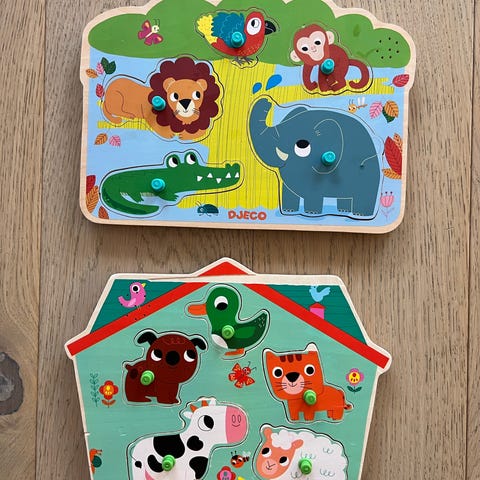 3 stk Pent brukt puslespill og putteboks. (2 fra Djeco)