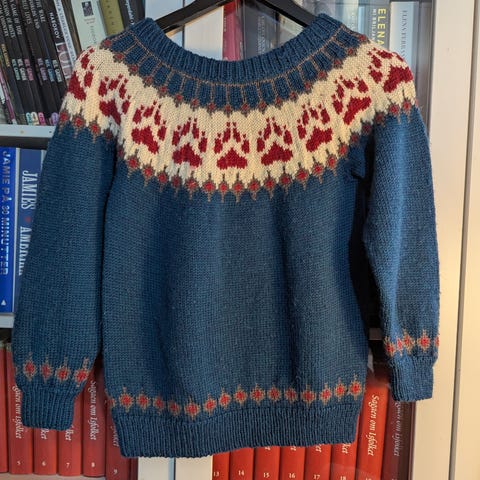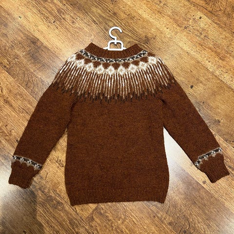 Strikket villmarksgenser/potegenser i ullgarn. Ca str 9-10 år. Ermelengde 35cm fra under erme.