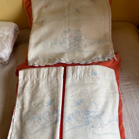 Kjøkkengardiner som består av en lengde beregnet for øverst på vinduet, og to kortere lengder beregnet for nede på vinduet. Men kan selvfølgelig brukes som en ønsker. Disse er noen år gamle, en god del brukt og har flere mindre bruksmerker. De fremstår likevel i god stand, vil jeg si, og er nyvasket. Se bilder for mål mm.
