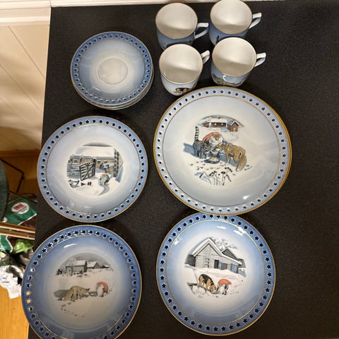 Sett med 6 dekortallerkener i porselen med ulike vintermotiver i landskapsstil. Tallerkenene har runde former og motiv i flere fargetoner, blant annet hvitt, blått, brunt og oransje. Egner seg godt som veggpynt eller til utstilling i skap eller på hylle. Selges samlet som ett sett.