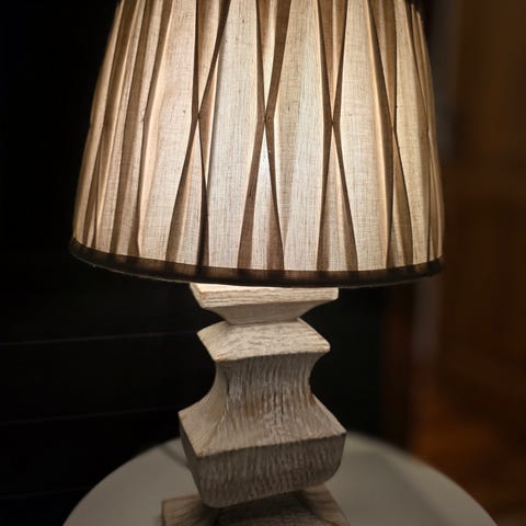 64 cm høy og 34 bred bordlampe med hvit skjerm og tremønster på sokkel. Bør hentes