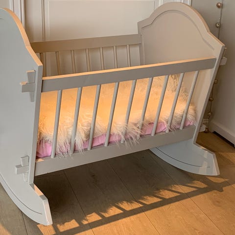 Pent brukt vugge. Ett lite merke på den ene siden. Ellers få bruksmerker. Madrass og laken til madrass kan følges med hvis ønskelig.