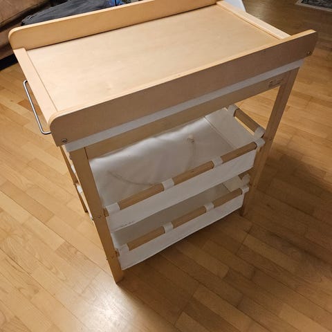 Diverse beholdere, bleiebøtte,oppbevaringsesker og stellematte følger med