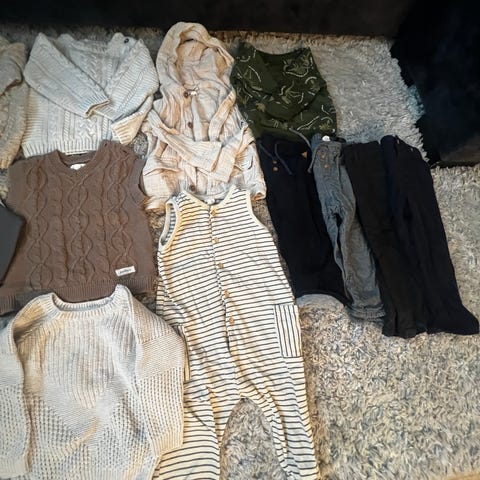 Selger en god del klær i str 92-98, nesten alt er brukt i barnehage, så flekker forekommer dessverre på 2 plagg (maling) og litt flekker på ull som ikke går vekk. Har tatt bilder, så ser dere. Det meste er i god stand og har mye bruk igjen.