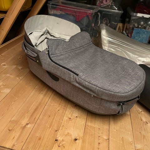 Stokke barnevogn i svart og grå farge. Vognen har liggedel med kalesje og myk innredning. Den har justerbart håndtak, varekurv under vognen og store hjul som gir stabil kjøring. Passer til daglig bruk på turer og i hverdagen med barn.