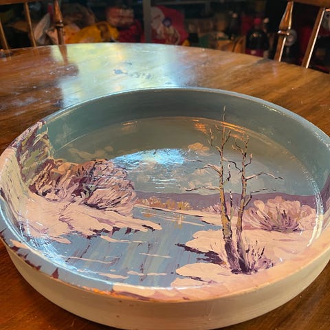 23 cm. Ø. 7 cm. dyp. Enkelt og pent mønster som passer mange steder. Hvor gammelt og hvem Storåsen er vites ikke. I bra stand bortsett fra den hvite flekken/skaden på baksiden.