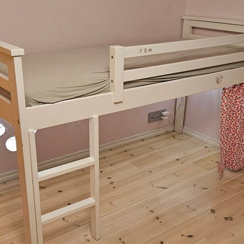 Delen som er markert med gult og madrassen er ikke inkludert. Jeg kan hjelpe med demontering. Det er en liten skade på bordet, men den er veldig liten. Kan hentes etter kl. 17 fram til 16.02.