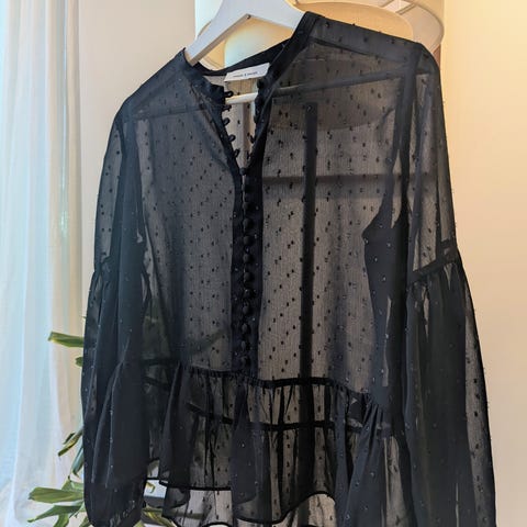 Sort, kort blondebluse fra H&M med lange ermer og dyp utringning. Knyting i front.