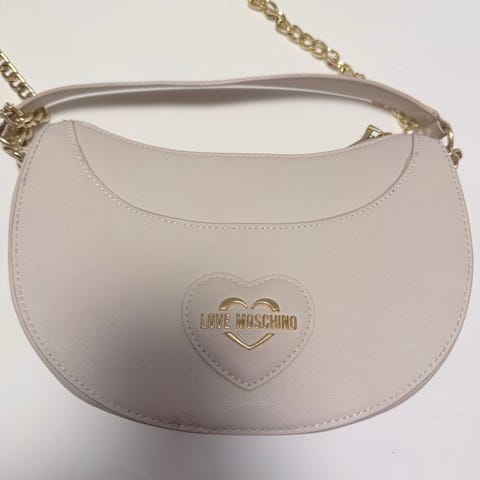Moschino Love Moschino skulderveske i kunstlær for dame. Vesken er i en brun/beige tone med strukturert overflate. Den har klaff med magnetlukking og dekorativ kjedelenke i metall foran, kombinert med justerbar skulderrem i samme materiale som vesken. Fronten er pyntet med Love Moschino-logo og hjerte-detalj i metall. Baksiden har en enkel, glatt flate med søm langs kanten. Innvendig åpning under klaffen gir plass til nødvendigheter som mobil, lommebok og småting. Egner seg godt som hverdagsveske eller til enklere penere antrekk.