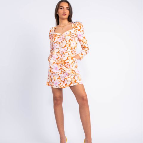 Dette er en feminin og figurnær kjole med vakkert blomsterprint. Den har delikat sweetheart-utringning, lange smale ermer med puff på skuldrene og knappelukking foran. Kjolen har også praktiske lommer og gir en flatterende fasong.