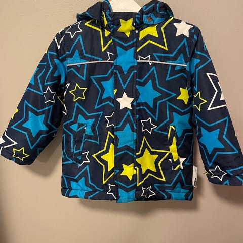 Jakken er laget av 100 % polyester og har et blått mønster med kontrastfarger. Den har hette og lange ermer. Vind og vannavstøtende. Står 2 på den, men litt stor