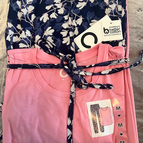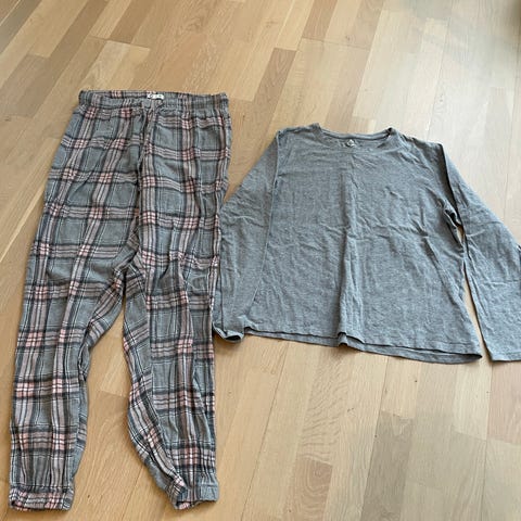 Cubus pysjsett for dame i størrelse M. Litt liten i størrelsen, føles mer som en S. Sett med langermet overdel og bukse i myk bomull. Fargen er grå med mønster. Overdelen har rund hals, og buksen har elastisk linning. Egnet som nattøy eller koseklær hjemme.