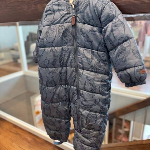 Newbie kjeledress i størrelse 80 for unisex barn. Dressen er blå med uglemønster og har hette. Yttermaterialet er vattert, og innsiden har mykt fôr som gir ekstra komfort og varme. Passer godt som yttertøy i kjøligere vær.