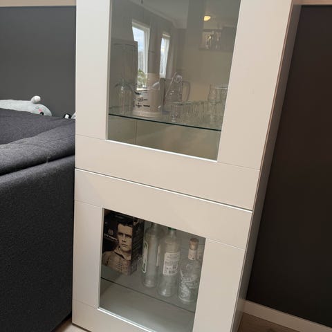 Selger to stk bestå stammer, mye av innmat er tatt over i ny bestå( annen størrelse), ikke noe galt med disse, skulle bare ha en annen høyde. Om ønskelig følger det med to skuffer, stor og liten. Fire glass dører, en grå dør, tre hvite hylleplater og fire glassplater