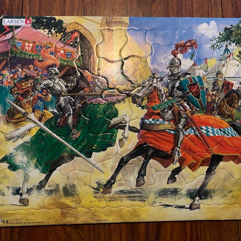 L.A. Larsen puslespill sett med flere motiver. Settet inneholder puslespill med prinsessemotiv ved slott og vogn, samt puslespill med hestemotiv på beite. Puslespillene er laget i solid kartong.