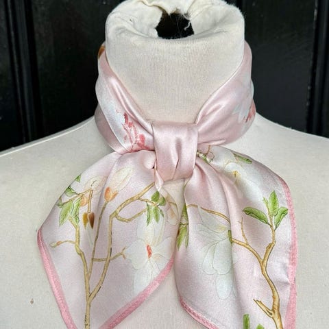 H&M skjerf i one size for dame. Skjerfet er laget av polyester og har et flerfarget blomstertrykk med rosa kant. Kvadratisk fasong som kan brukes rundt halsen, i håret eller som akses soar på veske eller håndledd. Materiale: 100 % polyester. Størrelse: one size.
