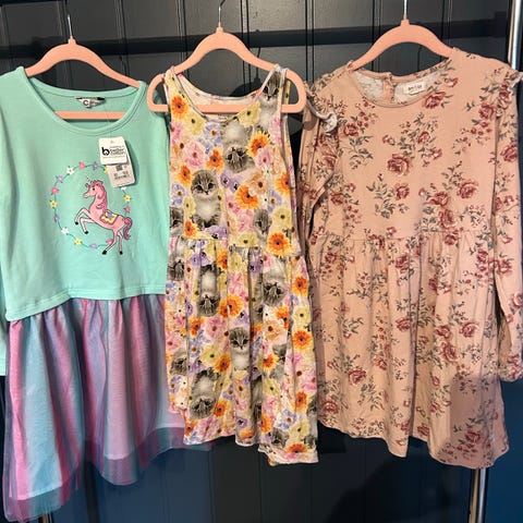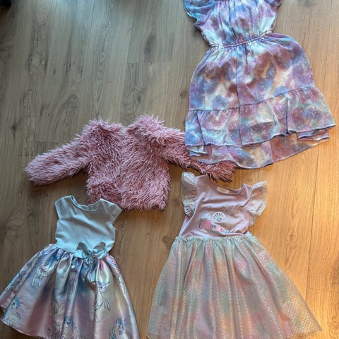 Selger kjoler i str. 110/116 samlet til kr 150,- mot henting. Rosa er fra kappahl og enhjørning kjøpt på temu.