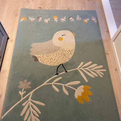 Teppe brukt på barnerom gis bort. Str 120x180 cm. Må hentes på Ganddal