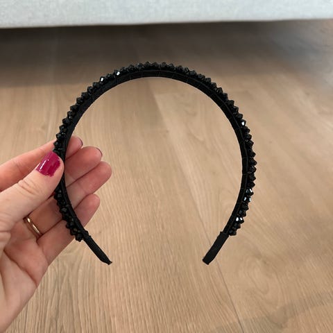 Dark hårbøyle for dame med dekorative krystaller. Hårbøylen har en polstret, buet form og er dekket av små, blanke krystaller over hele oversiden. Egnet som tilbehør til både hverdags- og penere antrekk. Laget i andre materialer med krystall som dekor.