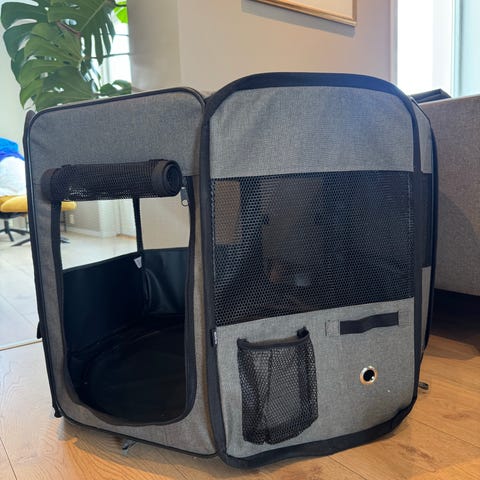 Denne valpegrinden kan enkelt settes opp og tas ned. Ingen verktøy behøves. Den har en hengslet dør med sikkerhetslås for enkel tilgang.