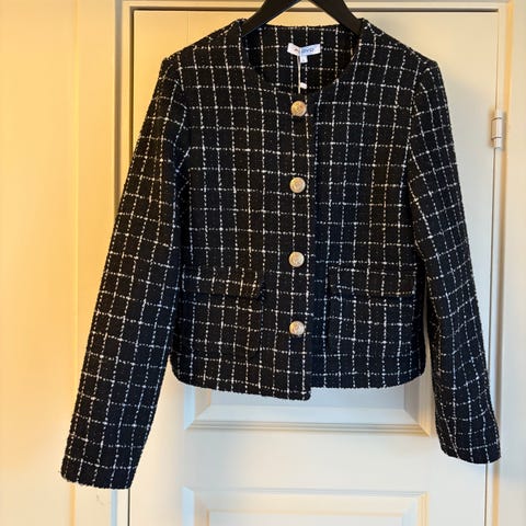 Floyd jakke for dame i størrelse L. Jakken er i svart tweedlignende polyesterstoff med rutemønster i lyse kontrastfarger. Den har lange ermer, rund hals og lukkes med knapper foran. Flere lommer og dekorative knapper foran. Fôret innside i glatt stoff for bedre komfort. Passer som penjakke eller lett ytterjakke til hverdags og mer formelle anledninger.