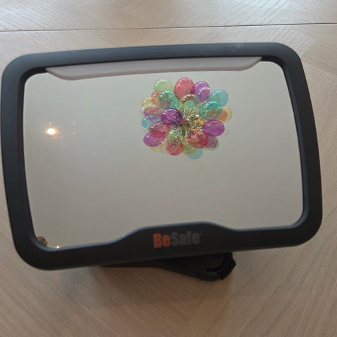 Benbat Oly Active Baby Car Mirror bilspeil for bakovervendt bilstol. Speilet har grønn ramme med figurdesign og festestropp for montering på bilens hodestøtte i baksetet. Leveres med fjernkontroll for styring av effekt og lydfunksjoner. Egnet for bruk i bil for å kunne se barn i bakovervendt bilstol under kjøring. Og underholde barnet.