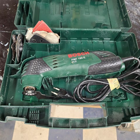 Bosch PMF 180 E multikutterverktøy som fungerer fint. Oscillerende multiverktøy egnet til ulike typer arbeider som saging, sliping og skraping i tre, plast og metall, avhengig av tilbehør. Leveres i original plastkoffert som gir praktisk oppbevaring og transport. Elektrisk drevet via strømledning.