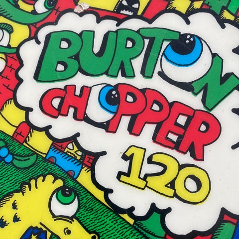 Burton Chopper snowboard på 120 cm med medfølgende bindinger. Sko str 35,5 Brettet har et barnevennlig design med tegneseriefigurer i grønn- og blåtoner. Snowboardet er egnet for barn og nybegynnere som ønsker et lettkjørt brett til bruk i bakke og park. Bindingene er montert på brettet og tilpasset barnesko. Dette er et twintip-brett som kan kjøres i begge retninger.