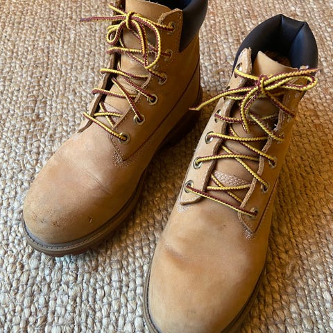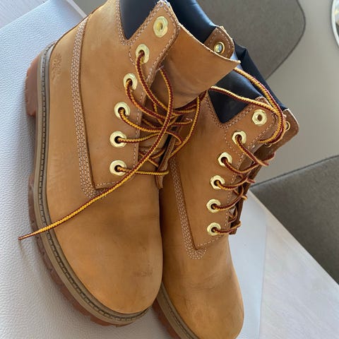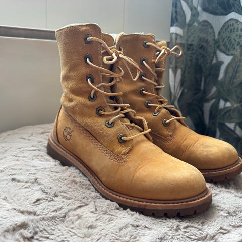 Timberland støvler i størrelse 36. Modellen er klassiske snørestøvler i beige skinn med polstret ankelkrage i mørk kontrastfarge. Sålen med grovt mønster for godt grep. Egner seg til hverdagsbruk og utendørsaktiviteter i kjøligere vær.