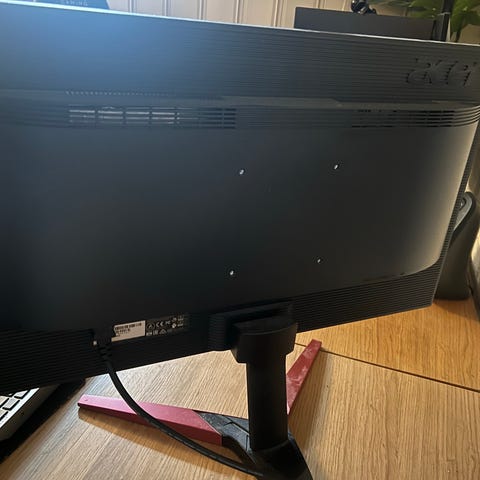 AOC skjerm 24 tommer i svart utførelse. Skjermen har flat panel og står på en rektangulær fot. Strømadapter og kabler vises på bildene. Egner seg til vanlig PC‑bruk som kontorarbeid, skole eller enkel underholdning der en 24-tommers skjermstørrelse er passende.