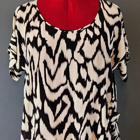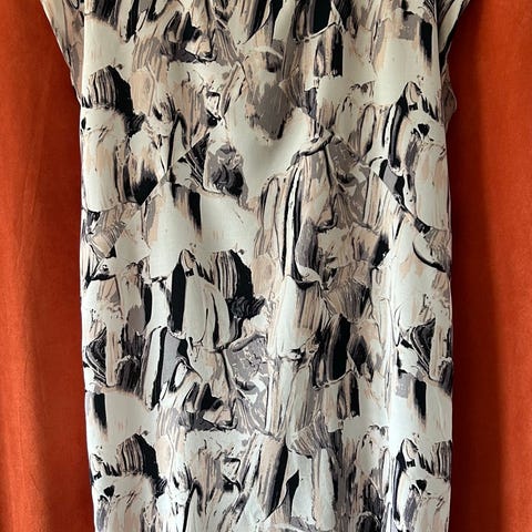 DAY Birger et Mikkelsen bluse i silke for dame i størrelse 36. Blusen er flerfarget med et grafisk mønster i hovedsakelig mørke og lyse toner. Modellen er ermeløs med kontrastfelt langs knappestolpen og på skuldrene. Materialet er lett og mykt, egnet til bruk både til hverdags og mer formelle anledninger, og kan kombineres med både bukser og skjørt.
