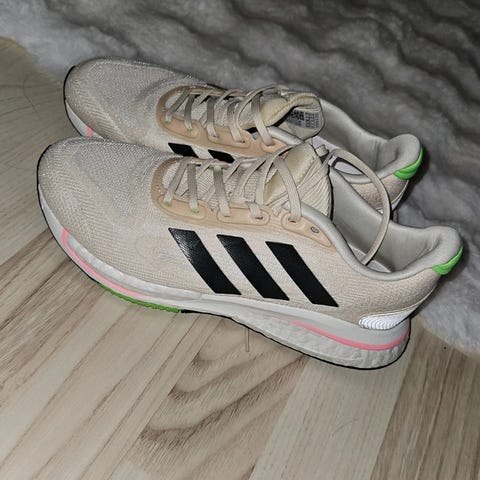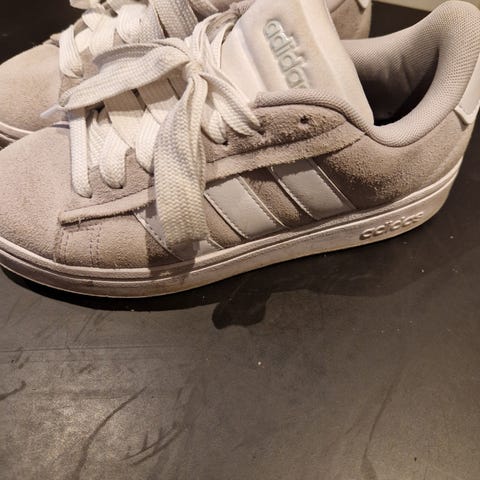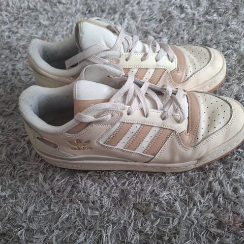 Adidas sko, str. 38. Brukt av ett barn. Noe slitt hælkappe på den ene skoen, kun slitt gjennom det første tynne tøylaget.