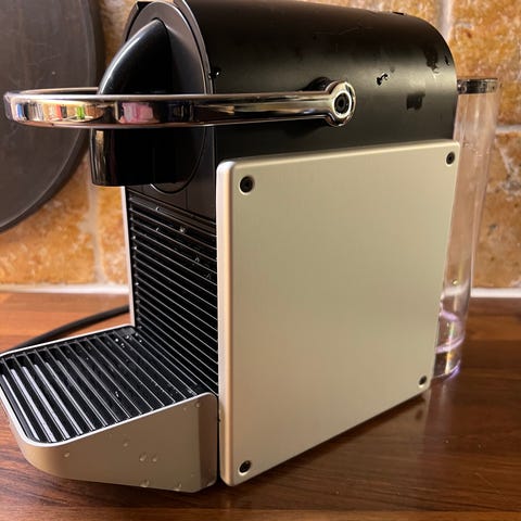 Nespresso kapselmaskin for espressokapsler. Maskinen har avtakbar vanntank på baksiden og dryppbrett i front som kan tas ut for rengjøring. Kapselholderen åpnes fra toppen, og maskinen har strømledning med jordet støpsel.