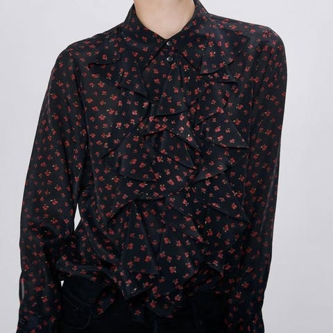 Blusen er flerfarget med et rødt mønster på rosa bunn, og den har lange ermer med volangdetaljer og knytebånd i halsen. Stoffet i DvF blusen er lett og fallende, passer til både hverdag og fest.